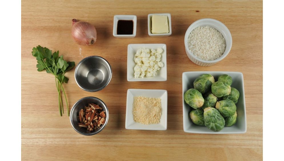 You can count on this hearty, creamy risotto to lift your spirits inside and out. No need to be intimidated by this iconic Italian import - a trusty wooden spoon and good stirrin' hand are all you need to make this rich, tender rice dish. In our version, the nutty aroma of browned butter is suffused throughout the rice, and roasted Brussels sprouts and pecans top it off. Tip: This recipe has a shallot, which sometimes is rough to mince. Easiest way to mince shallot? Make thin slices lengthwise, then slices across, resulting in minced shallot.