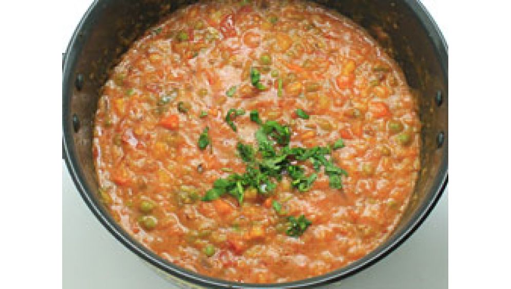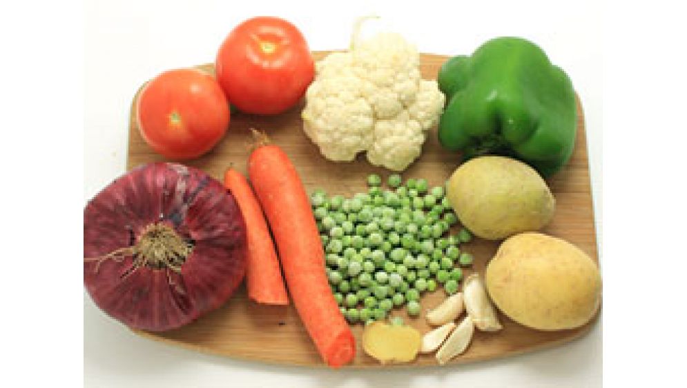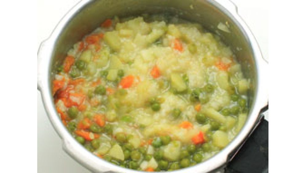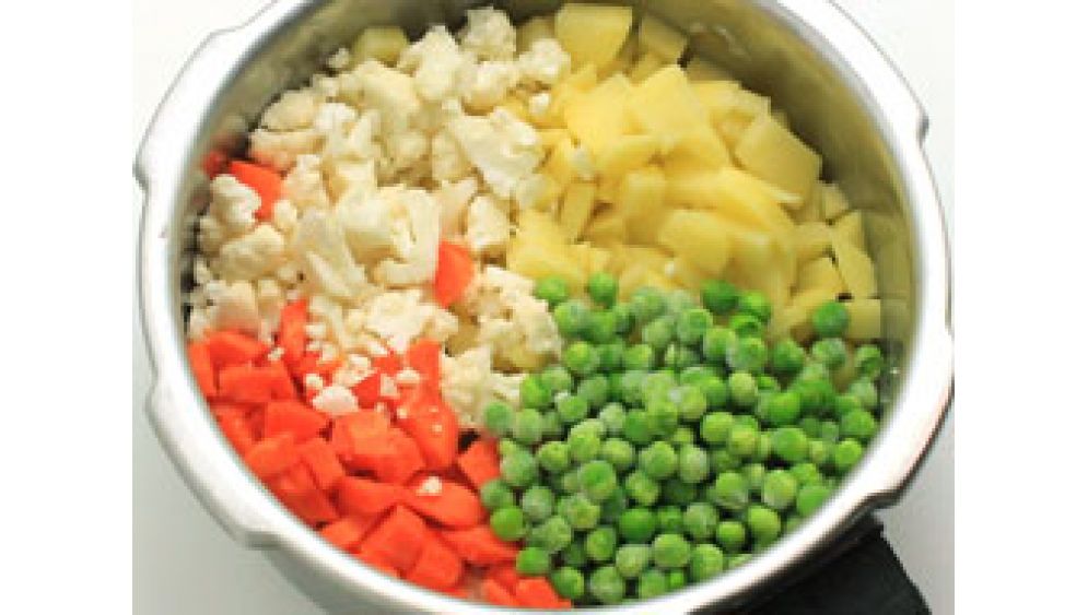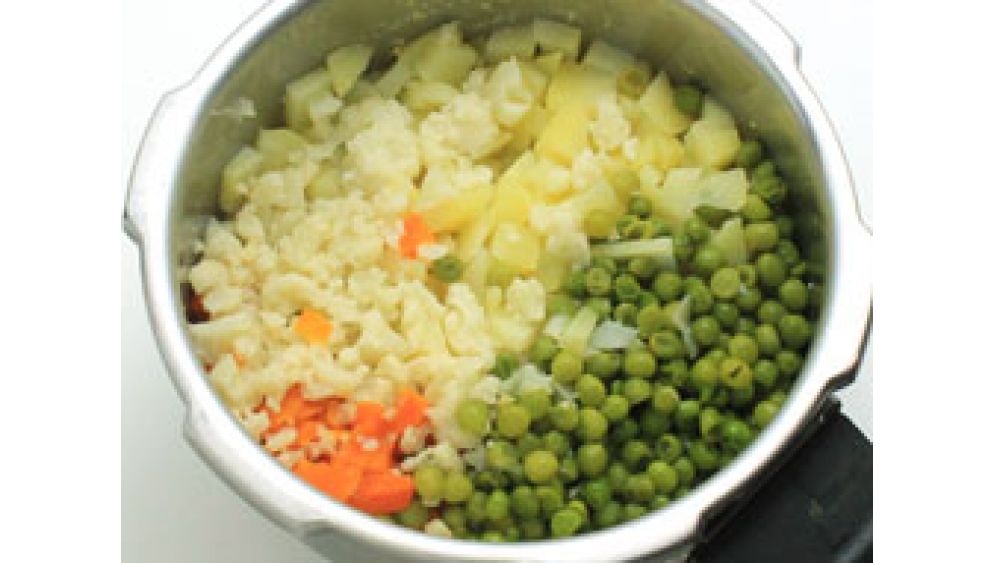 Transfer chopped potato, cauliflower, carrot and green peas into a 2-3 liter capacity pressure cooker. Add 1/2 cup water and salt to taste.