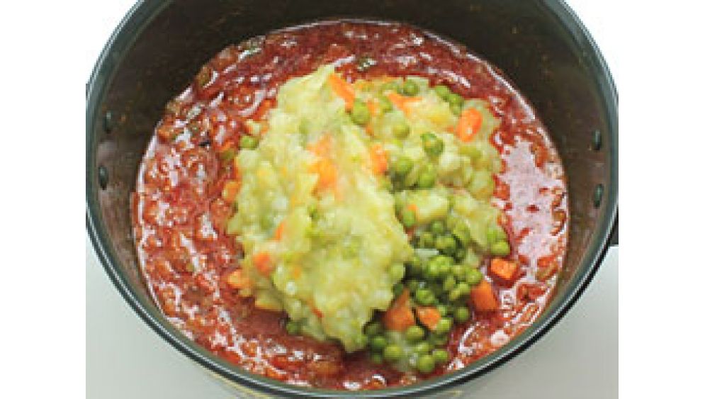 Mash the boiled vegetables gently with potato masher or using the backside of a large spoon until little chunky texture. You can mash cooked veggies into a texture you like – with small chunks or smooth with no chunks at all. The texture of your bhaji would depend on how you mashed the veggies.